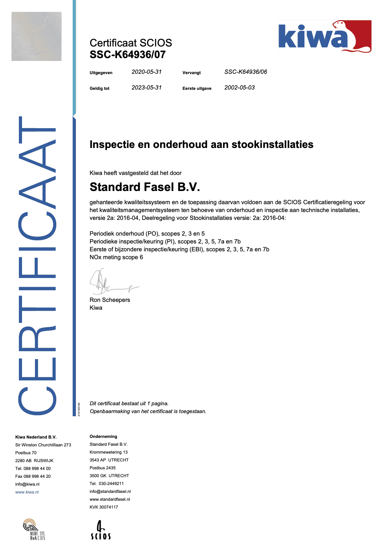 Standard Fasel is door SCIOS gecertificeerd voor het uitvoeren van onderhoud en inspecties in de volgende scopes;
