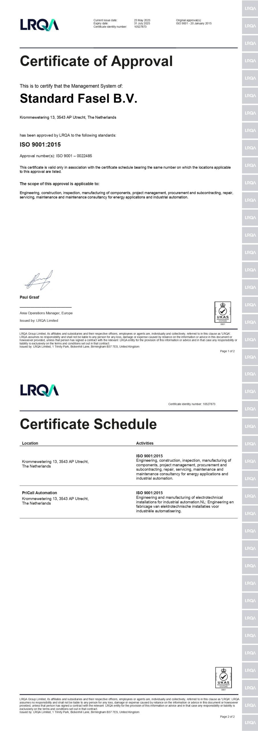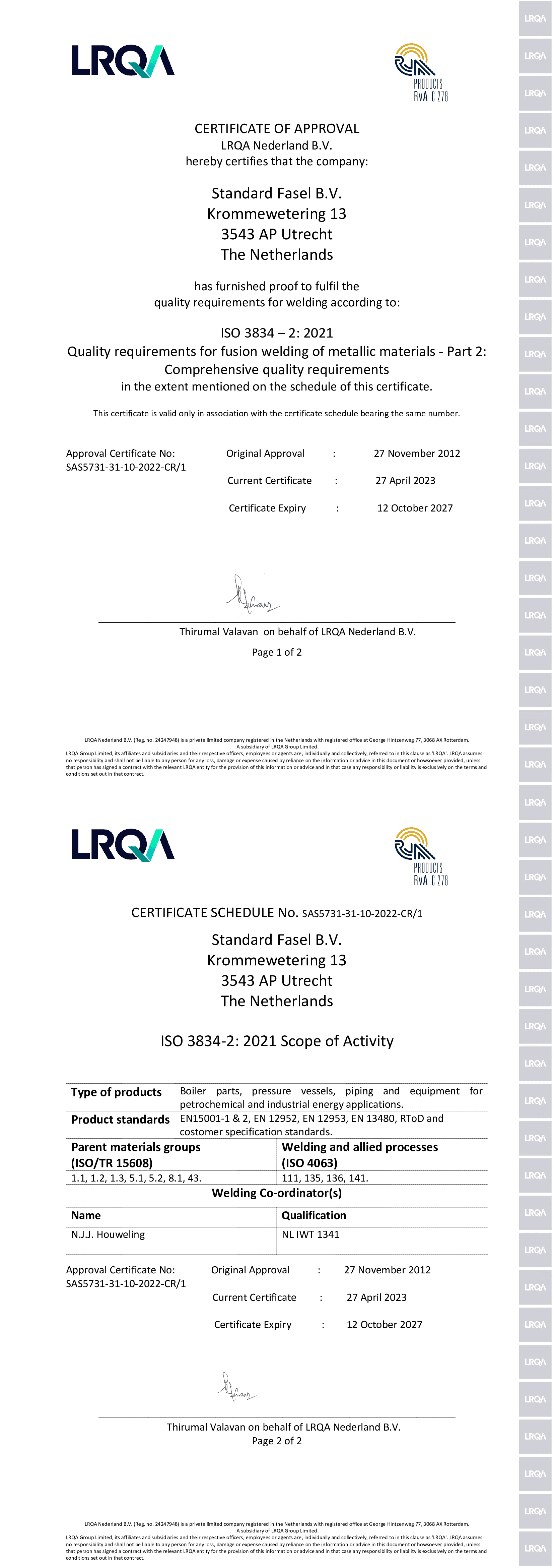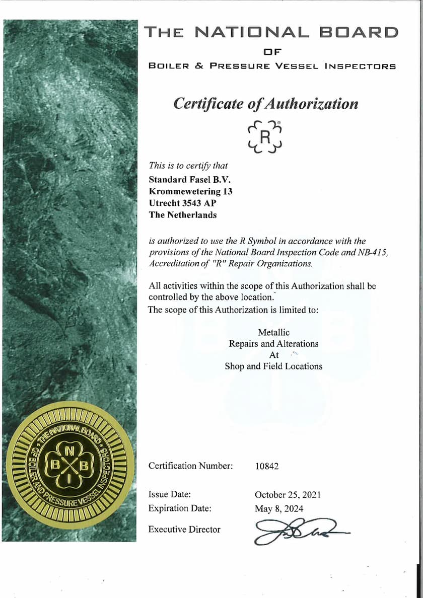 De hoge kwaliteit en kundigheid van ons geleverde werk wordt onderschreven door de certificaten ISO 3834-2, ISO 9001, NBBI R, ASME S en ASME U. Standard Fasel is 1 van de slechts 2 organisaties in heel Nederland die over de 3 ASME certificaten beschikt.