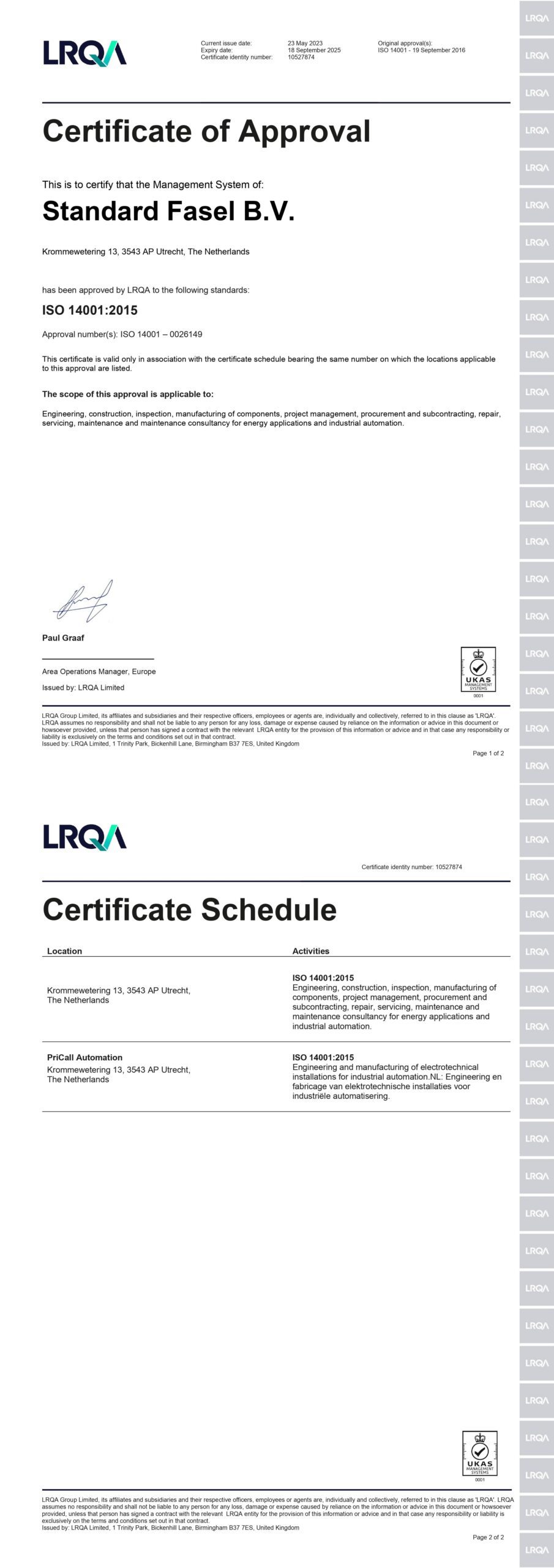 Standard Fasel is gekwalificeerd voor de ISO 14001, deze normering biedt een goede structuur om milieu risico’s en de beheersing hiervan vast te stellen en in te richten.