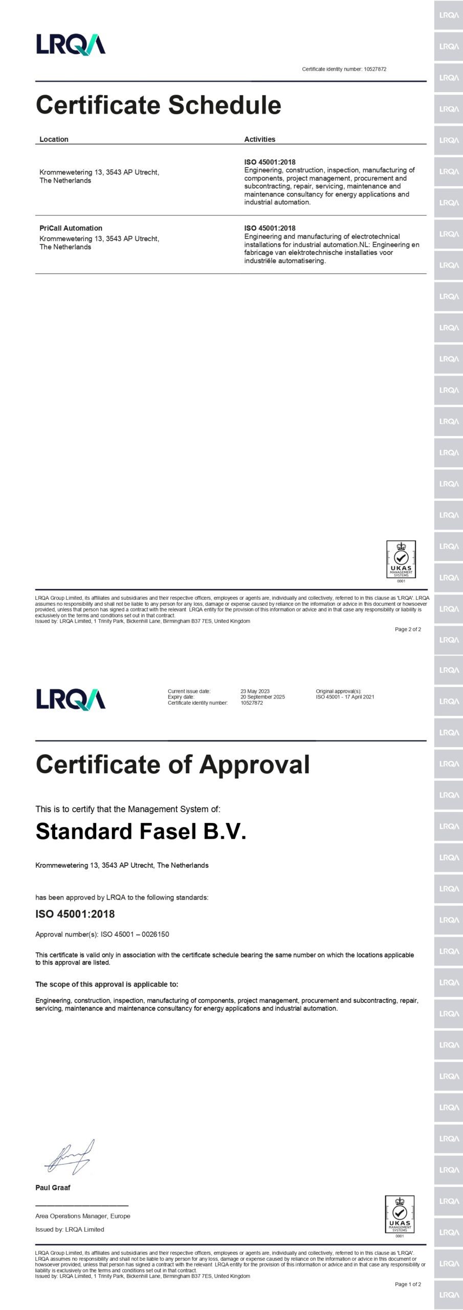 Bij Standard Fasel staat veiligheid voorop. We zorgen dat uw medewerkers en die van Standard Fasel veilig te werk kunnen gaan. We voldoen aan de normering voor ISO 45001 en beschikken vanzelfsprekend over een VCA ** certificering.